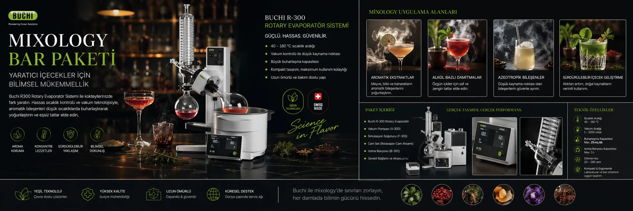 Yaratıcılığın ve bilimin buluştuğu noktada geliştirilen Mixology Koleksiyonları, modern bar ve mutfak konseptleri için özel olarak tasarlanmış çözümler sunar. Büchi Labortechnik AG teknolojisiyle desteklenen bu koleksiyonlar; aroma, teknik ve sunumu bir araya getirerek, içecek ve gastronomi deneyimini yeni bir seviyeye taşır.